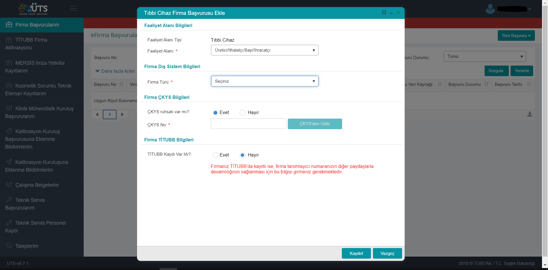 Ürün Takip Sisteminde firma kaydı için https://utsuygulama.saglik.gov.tr/UTS/ adresinden BAŞVURU ekranına girilir. Burada e-imza, e-devlet, elektronik imza yöntemlerinden biriyle giriş yapılır. Yeni Başvuru sekmesinin altında Kozmetik Firma, Tıbbi Cihaz Firması, Tıbbi Hizmet Sağlayıcısı, Sağlık Hizmet Sunucusu, Kemoterapı Üretici/İthalatçı Firma, Biyosidal Firması seçenekleri bulunmaktadır. İlgili firma türü seçilip Firmanın faaliyet alanı, Firma Türü, ÇKYS bilgileri, TİTUBB kaydı bilgileri doldurulduktan sonra başvuru yapılır. Aynı zamanda başvuru ekranında başvurunuzun durumunu takip edebilir, imza yetkilisi kayıtları, eleman kayıtları, teknik servis başvurusu gibi bilgiler sorgulanabilmektedir.